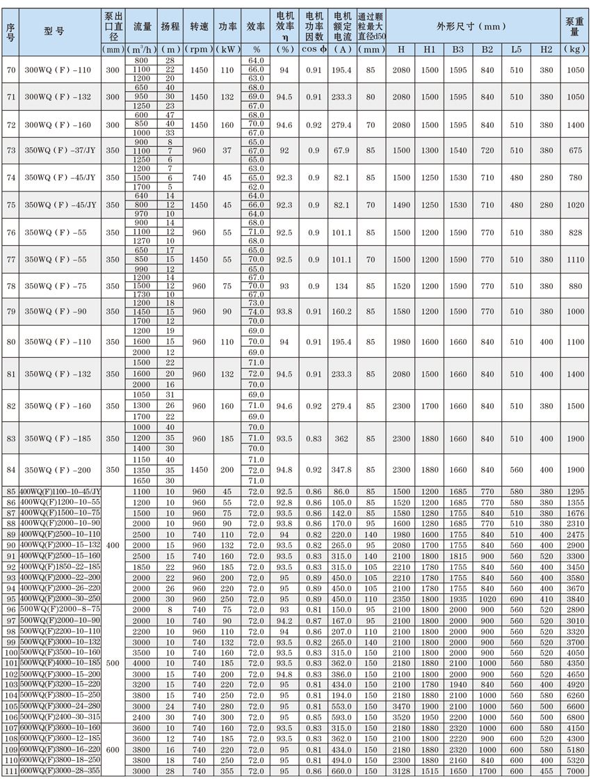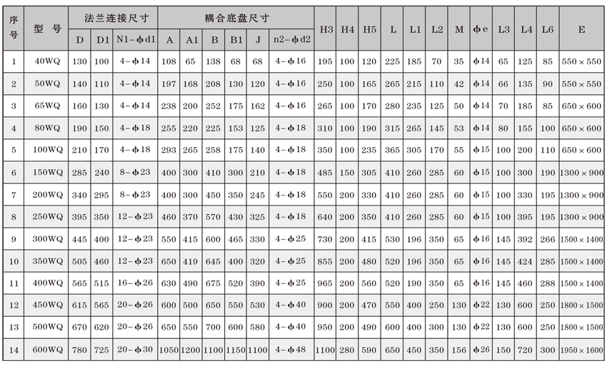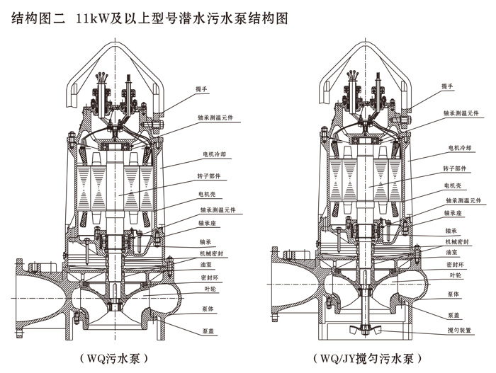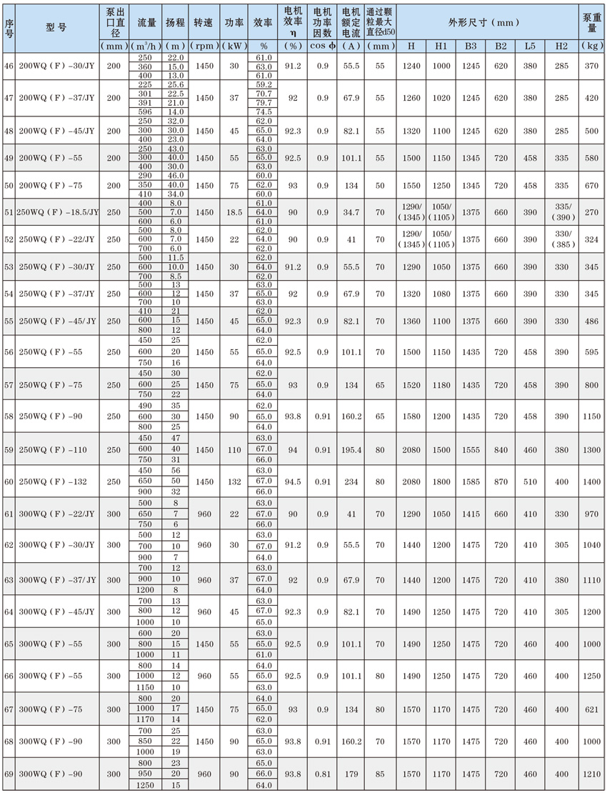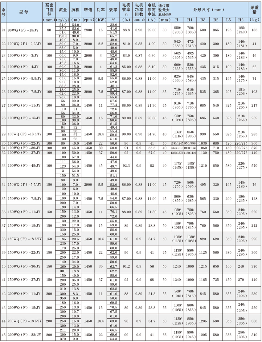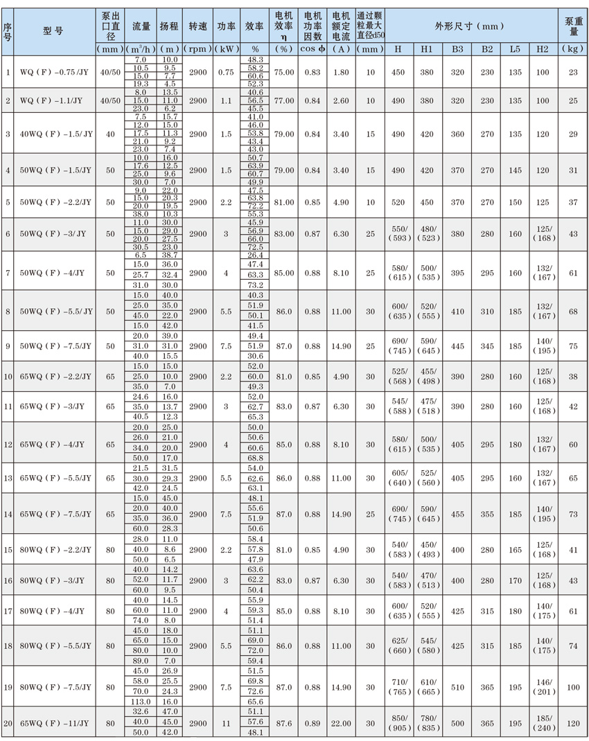 為了使WQ(F/JY)系列潛水污水泵以更好的可靠性、更高的機組效率服務于客戶,在總結多年生產制造該系列泵的經驗積累的基礎上,再一次更新優化了水力模型,創新機械密封、軸承結構,采用優質電機材料,根據使用環境條件,18.5kW及以上泵對電機循環冷卻,保證可靠性。全系列共100余種規格,通過使用原型葉輪和改型葉輪及其切割,在型譜性能范圍內,可提供恰當滿足用戶所需要的任意流量、揚程工作點的水泵。