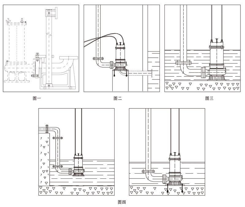 2、最低運行液位:見安裝尺寸圖(無電機冷卻系統),有電機冷卻系統時,水位只要保證泵能正常輸水;